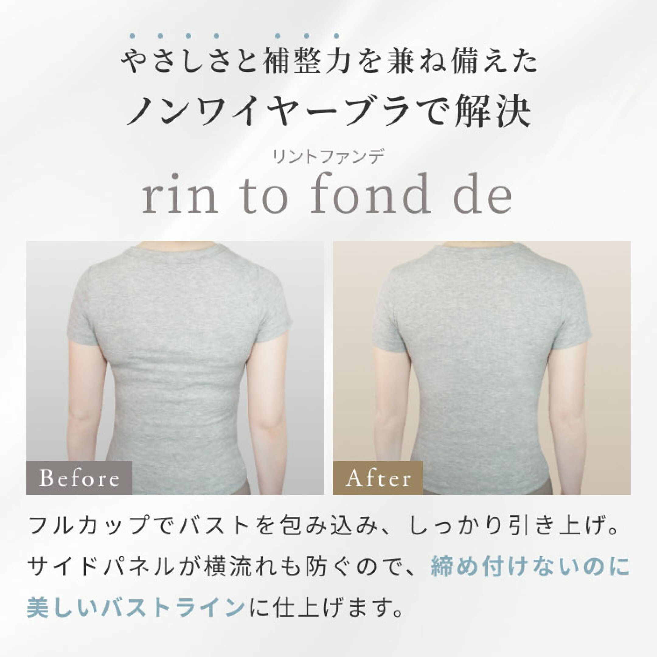 ブランド名の『rin to fond de(リントファンデ)』は、日本語の「凛とした」という言葉と、フランス語で”身体の土台となる下着”という意味を持つ「fond de robe」を組み合わせた造語です。 ファンデーション(下着)で凛とした姿やこころを手にしてもらえるようにという想いを込めて付けました。 コンセプトは、『我慢しないで整うを叶える普段のままの下着』。ボディラインは整えたいけど、快適さもデザインも諦めたくない大人女性に向けたブランドです。 体を無理に締め付けて苦しさを感じたり、不自然なほどに形づくることないよう、体の厚みや骨格を考慮した独自の設計。 自分自身の体に馴染むように整えてくれる、そんな下着をつくりました。 ◤ いつものままのあなたで 心地よく 動きやすく 美しいを ◢ リントファンデは、そんな想いでできたブランドです。 ボディラインにもう悩まない! SNSや雑誌でも人気の『rin to fond de』、ぜひGETして、快適に理想の美ボディを手に入れてください^^* オシャレをめいいっぱい楽しみましょう♪