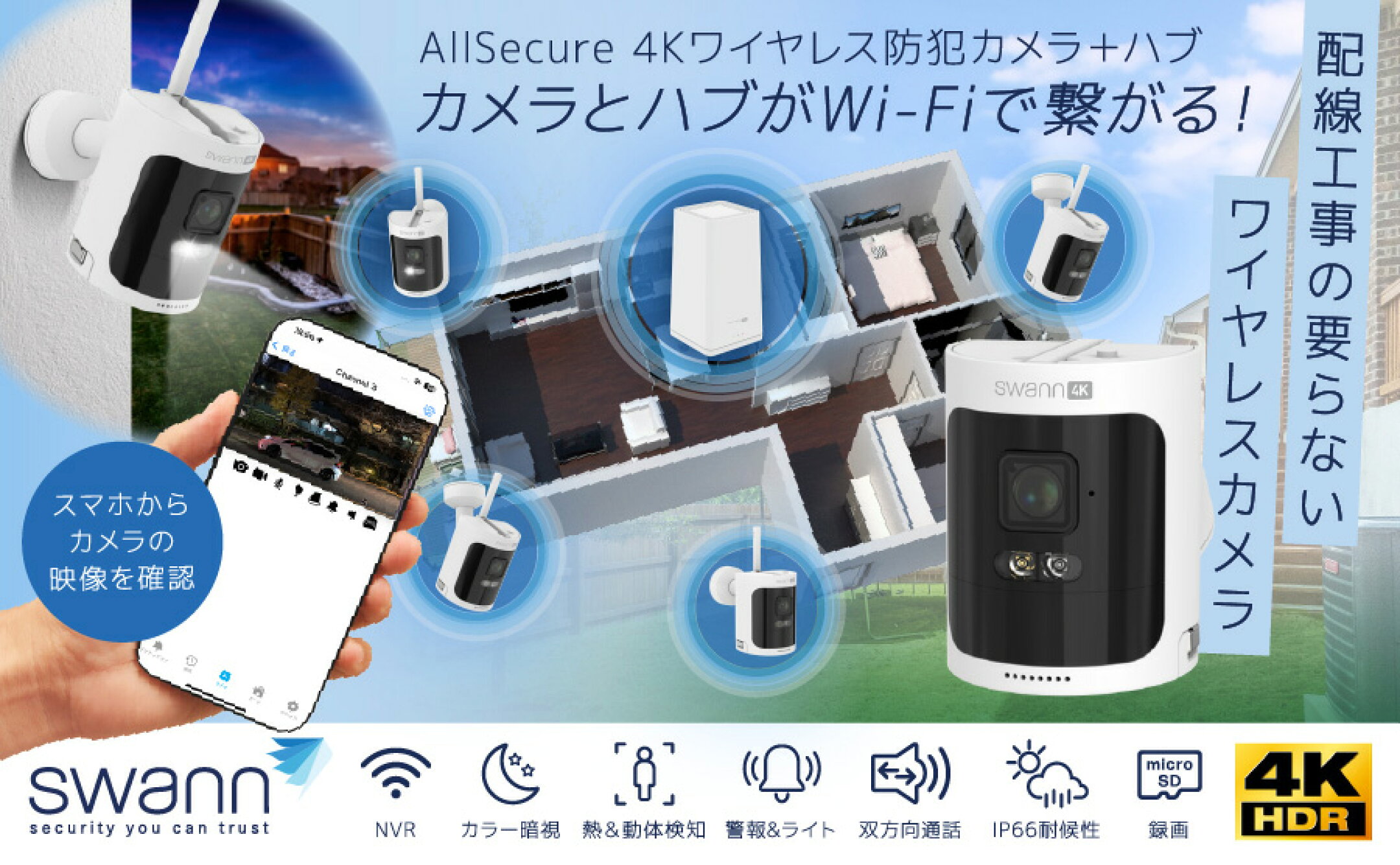防犯カメラ Swann AllSecure 4K ワイヤレスカメラ NVRシステム alexa対応 セキュリティカメラ 4台+ハブ 工事不要 ネットワークカメラ 家庭用 屋外 屋内 スマホ 音声録音 防犯 セキュリティーカメラ 暗視 顔認証カメラ 録画機能 SDカード スワン SWNVW-AS4K64SD4CAM-JP