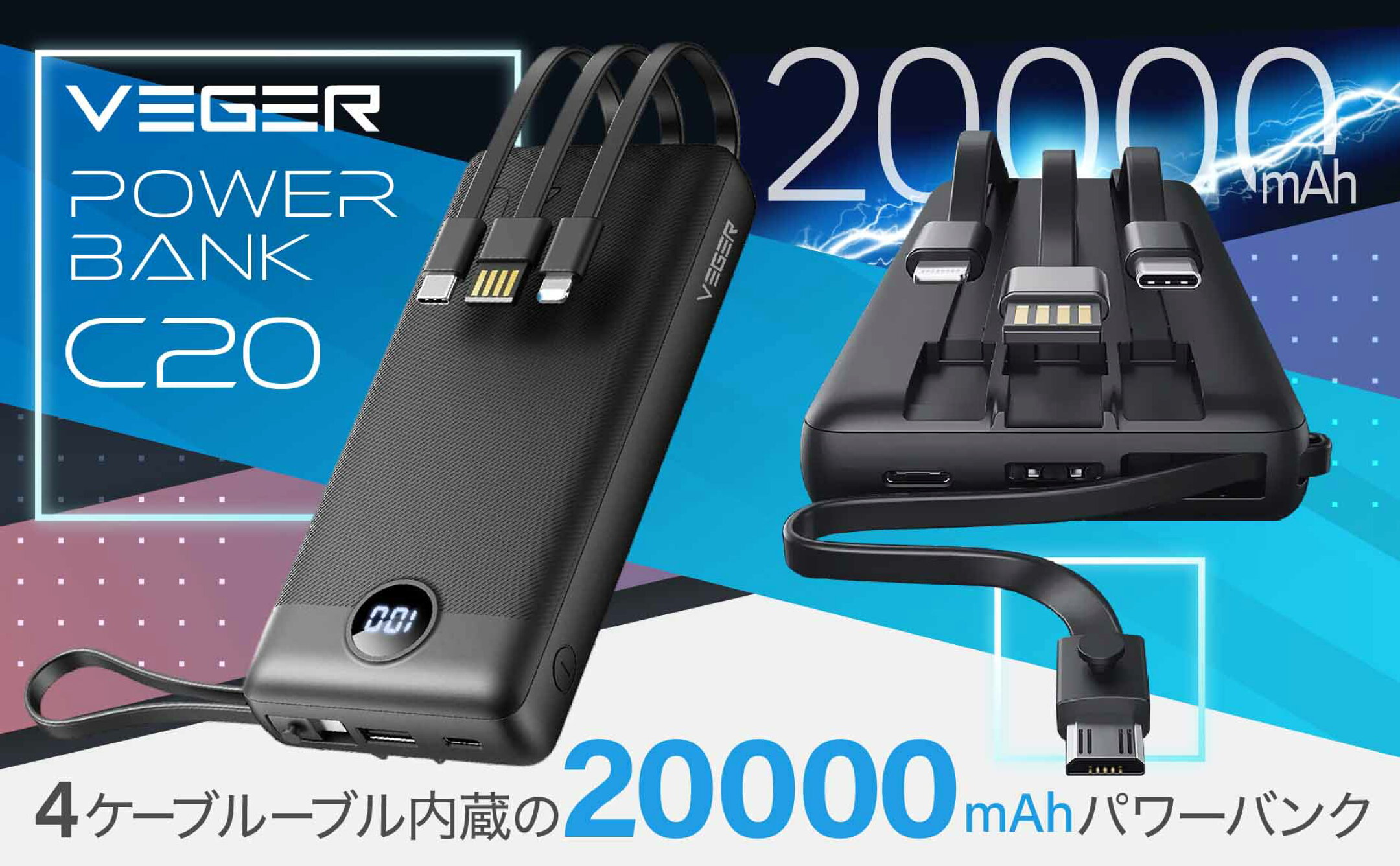 4ケーブル内蔵の20000mAhのモバイルバッテリー