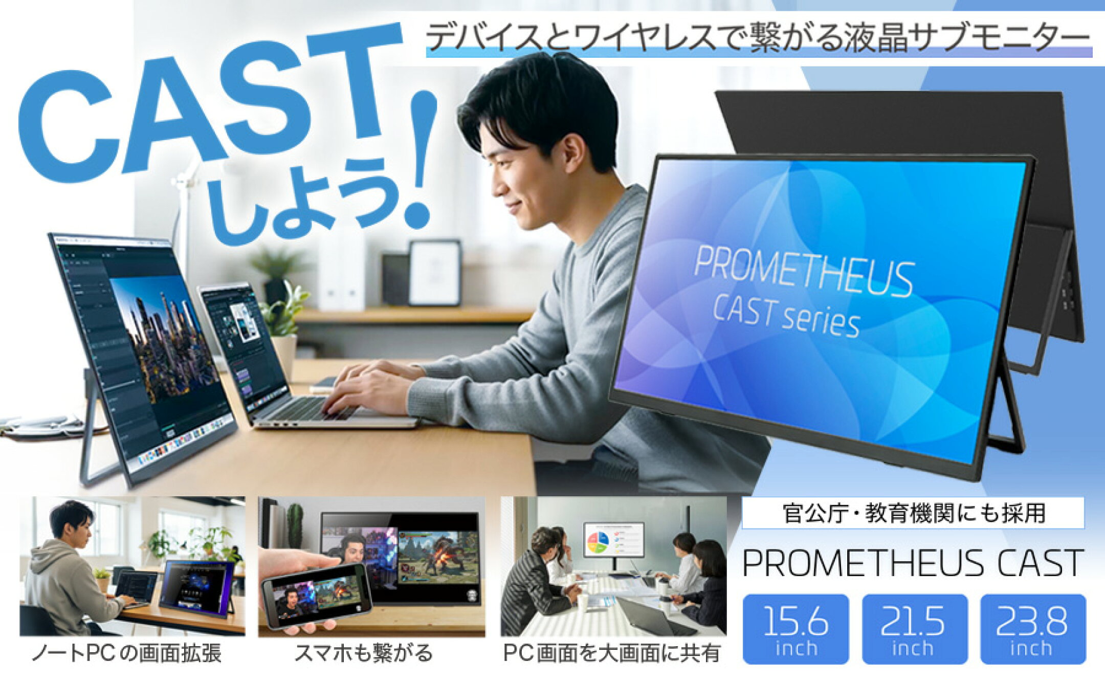 ワイヤレスモニター 15.6/18.5/21.5/23.8inch モバイルモニター プロメテウスモニター ワイヤレス接続 iphone17対応 PROMETHEUS CAST バッテリー内蔵 モバイル液晶 無線 モニター PC セカンドモニタ 視野角170° 外部モニター IPSパネル MONITOR Mirroring Miracast