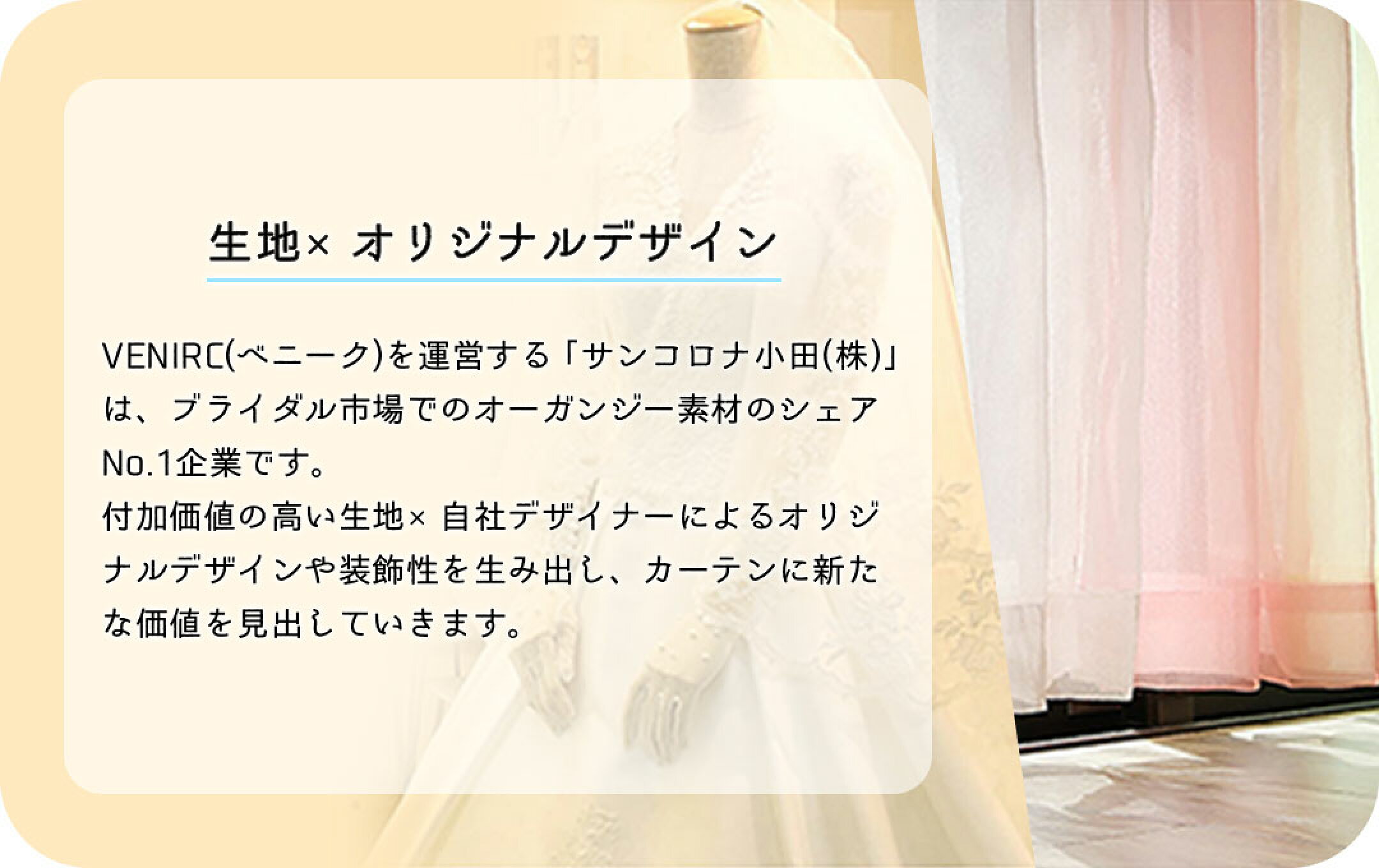VENIRC(ベニーク)は、”技術はロマンであり、未来は予測するものでなく創造するものである”を信念とした、設立約50年になる「サンコロナ小田(株)」の高い技術力と品質力の上に機能性と感性の花を咲かせ、「豊かさ、洗練さ」を求める今の時代を生きる人へ送る、自分に合うトレンドが見つかるインテリアファブリックショップです。