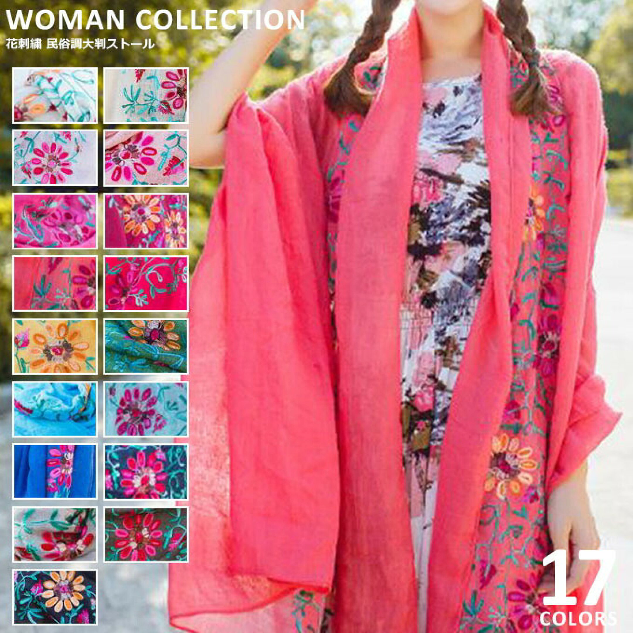 ストール 大判 【送料無料】 春 秋 夏 母の日 薄手 刺繍 花 おしゃれ 民族調 大人 かわいい ピンク ブルー エスニック ターコイズ 白 ホワイト ブルー ネイビー ネオンピンク レッド 赤 イエロー グリーン ターコイズ UV