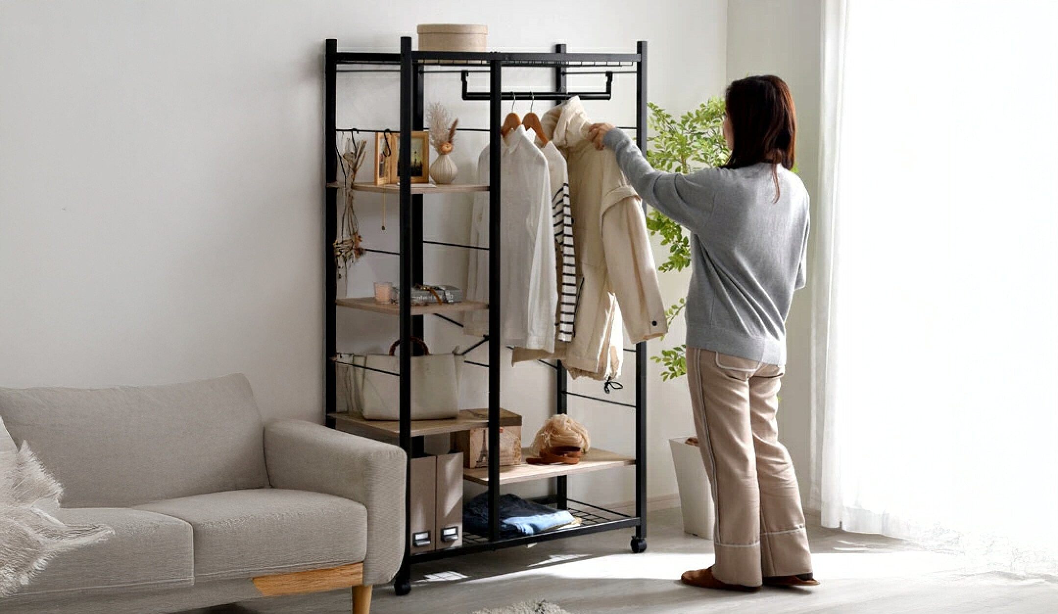 洋服を掛けるだけじゃ物足りない方にぴったりなのが「収納付きハンガーラック」。アイテムごとにしまえるスペースがあるから、衣類はもちろん、帽子やバッグ、小物類までひとまとめに収納できます。 収納スペースが少ないお部屋や一人暮らしの方にも大人気。 見た目にもこだわったおしゃれなアイテムを揃えました。「見せる収納」と「隠す収納」をバランスよく取り入れて、毎日の暮らしをもっと快適に整えませんか?